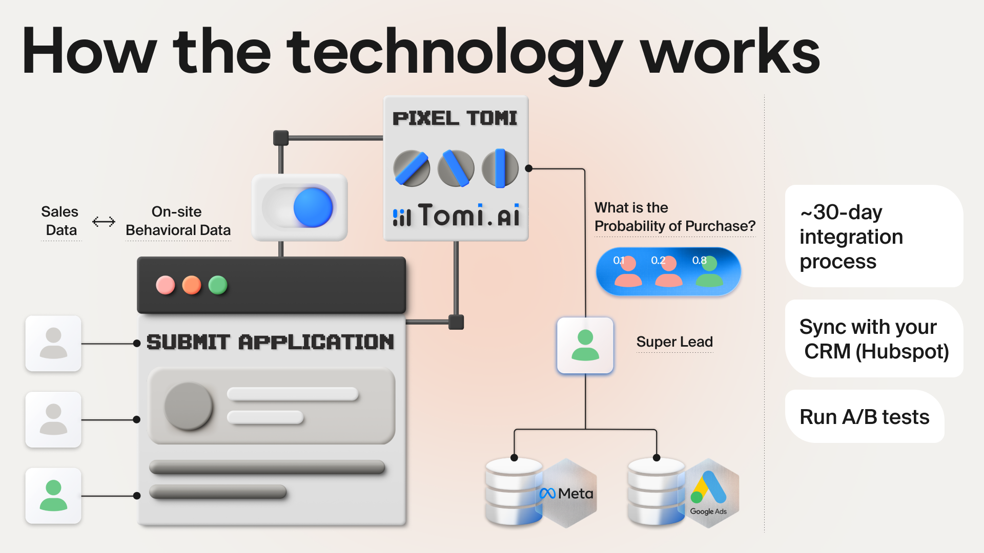 We selected Tomi.ai because its predictive models consistently identified high-intent users early in the funnel and pushed those events directly into Google and Meta in real time. This allowed us to feed high-quality predictive events into the algorithms and train automated strategies on users who behaved like future buyers — not just applicants.